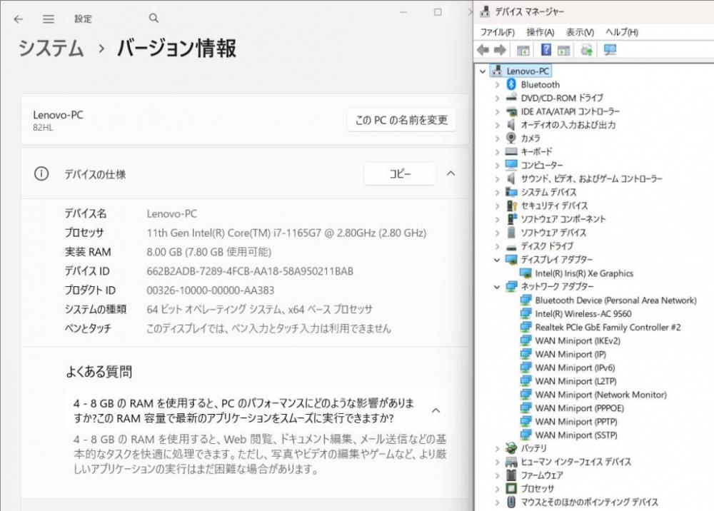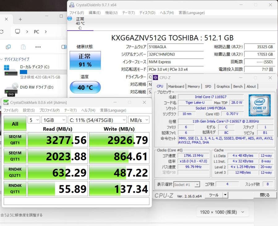 | CPU: 超高速 Intel 卓越性能 第11世代Core i7-1165G7 2.8Ghz、 4コア8スレッド (ターボ・ブースト利用時の最大周波数 4.7GHz) |