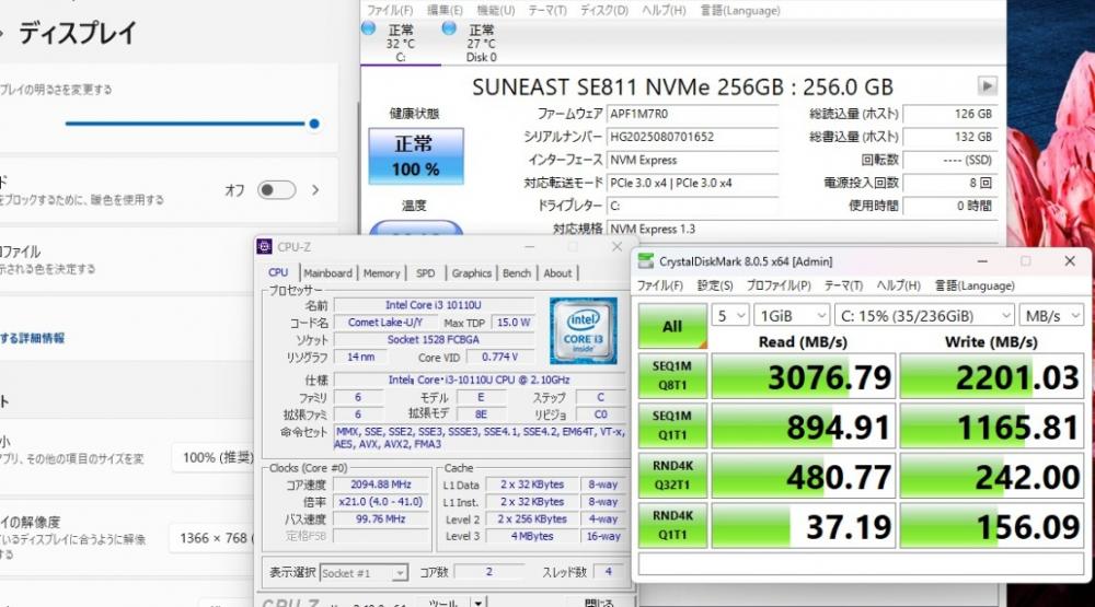 | CPU: 超高速 Intel 超高性能 第10世代Core i3-10110u 1.6Ghz、 (ターボ・ブースト利用時の最大周波数 4.1GHz) |