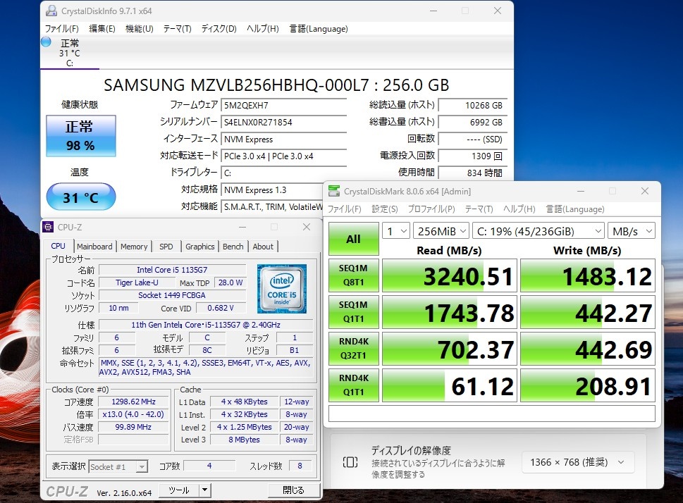 | CPU: 超高速 Intel 卓越性能 第11世代Core i5-1135G7 2.4Ghz、 4コア8スレッド (ターボ・ブースト利用時の最大周波数 4.2GHz) |