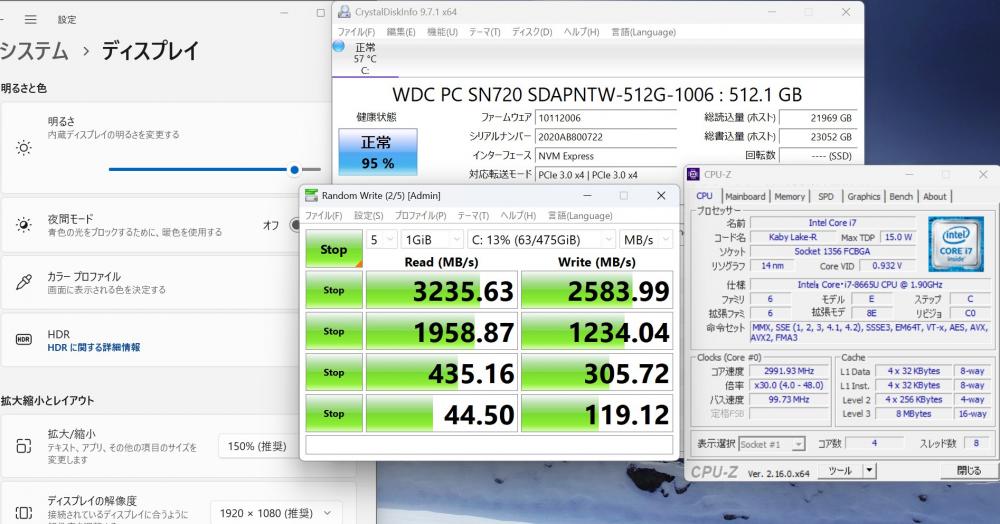 | CPU: 超高速 Intel 高性能 第8世代Core i7-8665U 1.9Ghz、 4コア8スレッド (ターボ・ブースト利用時の最大周波数 4.8GHz) |