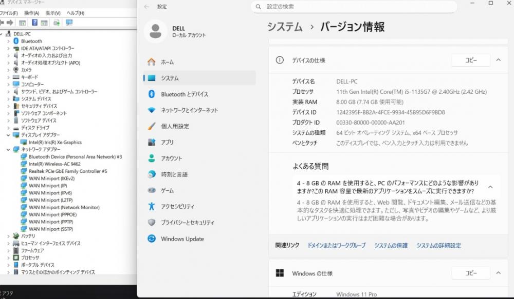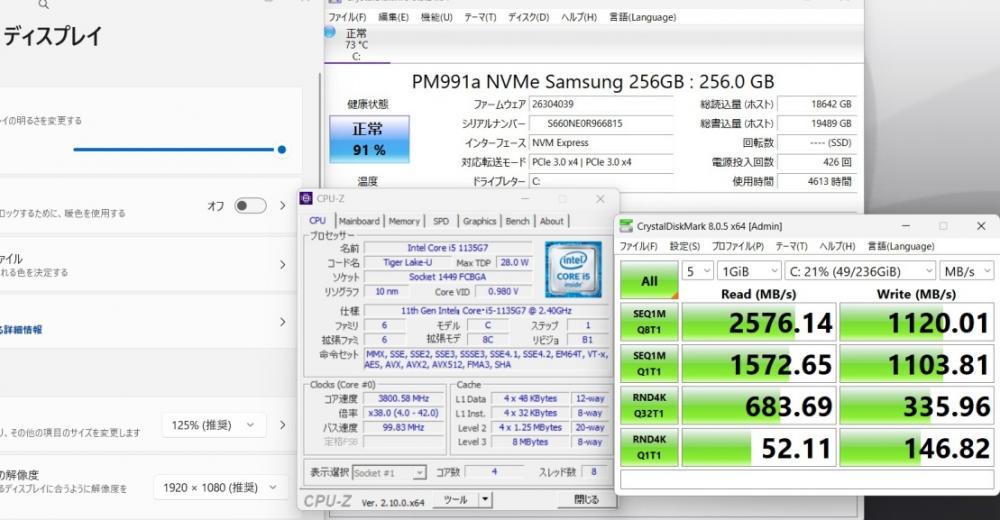 | CPU: 超高速 Intel 卓越性能 第11世代Core i5-1135G7 2.4Ghz、 4コア8スレッド (ターボ・ブースト利用時の最大周波数 4.2GHz) |