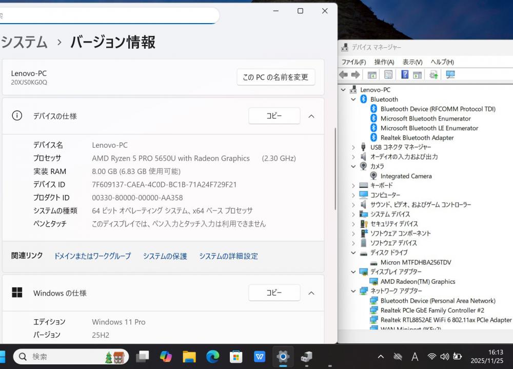 | 型番: Lenovo ThinkPad X13 Gen2 Type-20XJ |