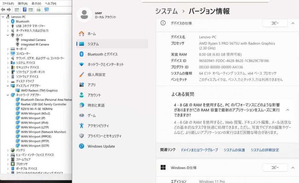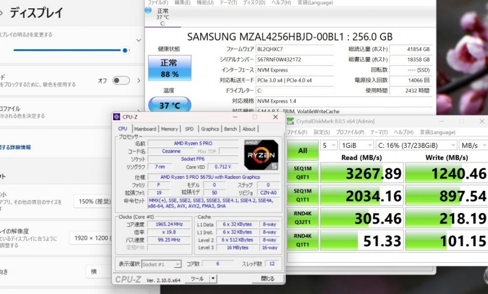 | CPU: 超高速 高性能 AMD Ryzen 5-PRO 5675U 2.3Ghz、 6コア12スレッド (ターボ・ブースト利用時の最大周波数 4.3GHz) |