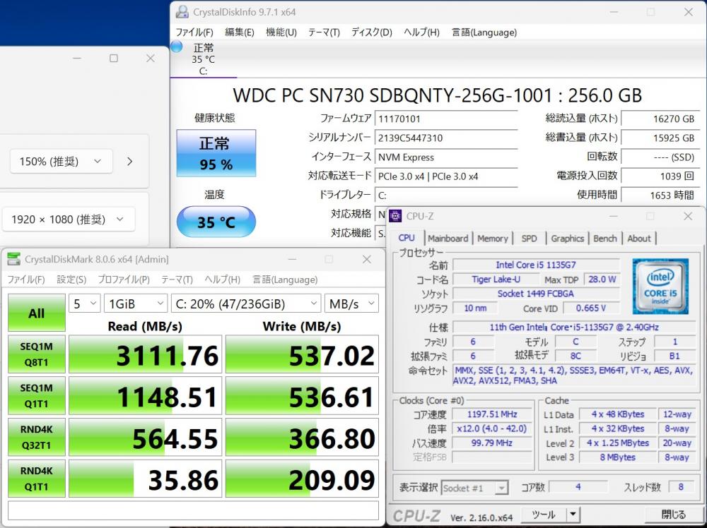 | CPU: 超高速 Intel 卓越性能 第11世代Core i5-1135G7 2.4Ghz、 4コア8スレッド (ターボ・ブースト利用時の最大周波数 4.2GHz) |