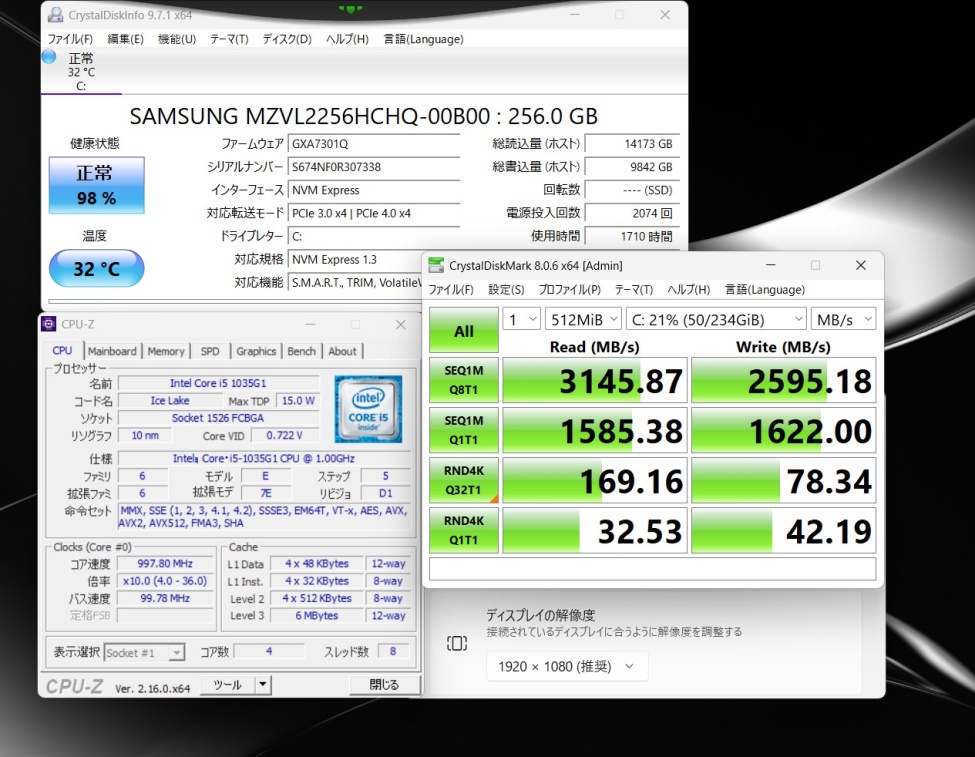 | CPU: 超高速 Intel 超高性能 第10世代Core i5-1035g1 1.0Ghz、 4コア8スレッド (ターボ・ブースト利用時の最大周波数 3.6GHz) |