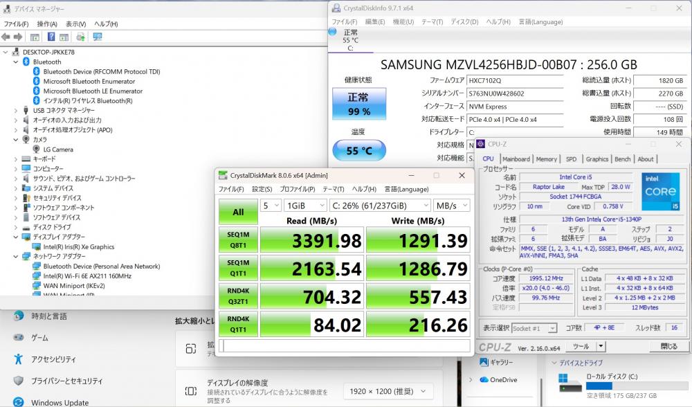 | CPU: 超高速 Intel 12コア 卓越性能 第13世代Core i5-1340P 1.9Ghz、 12コア16スレッド (ターボ・ブースト利用時の最大周波数 4.6GHz) |