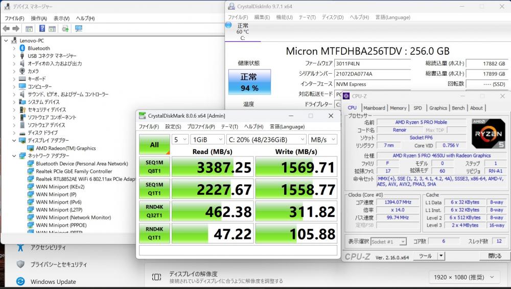 | CPU: 超高速 高性能 AMD Ryzen 5-4650U 2.1Ghz、 6コア12スレッド (ターボ・ブースト利用時の最大周波数 4.0GHz) |