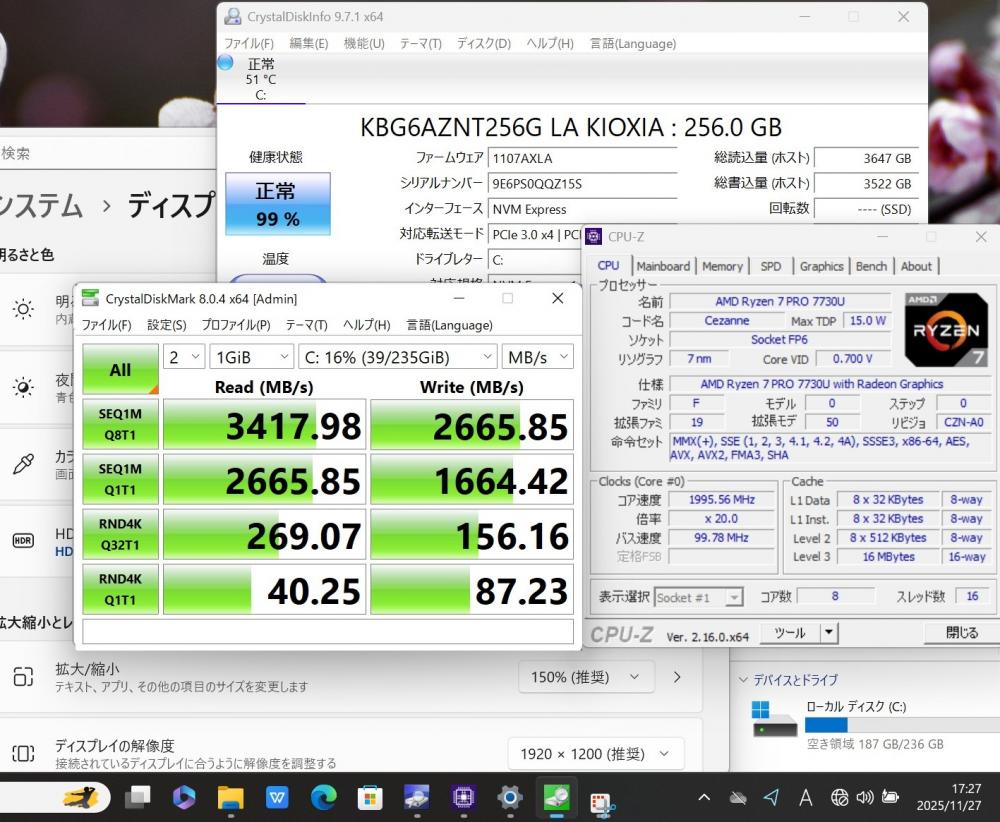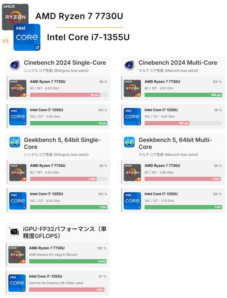 | CPU: 超高速 8コア 超高性能 AMD Ryzen 7-PRO 7730U 2.0Ghz、 8コア16スレッド (ターボ・ブースト利用時の最大周波数 4.5GHz) ( Ryzen7-7730Uの演算性能は、第13世代Core i7-1355Uとほぼ同じです。) |