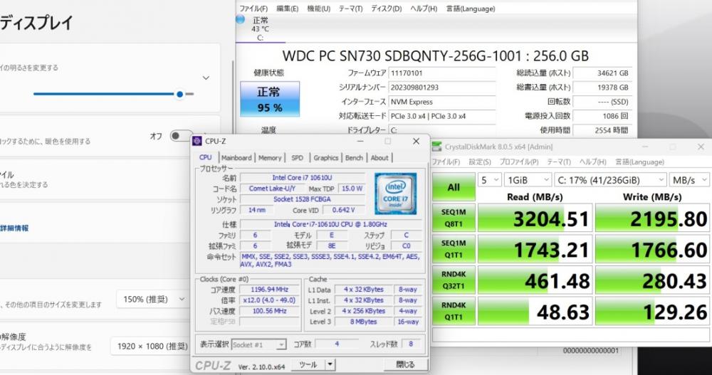 | CPU: 超高速 Intel 超高性能 第10世代Core i7-10610u 1.8Ghz、 4コア8スレッド (ターボ・ブースト利用時の最大周波数 4.9GHz) |