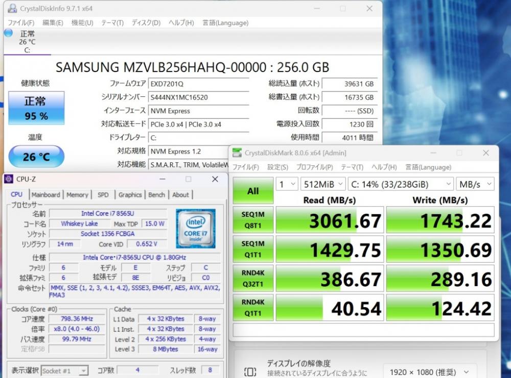 | CPU: 超高速 Intel 高性能 第8世代Core i7-8565U 1.8Ghz、 4コア8スレッド (ターボ・ブースト利用時の最大周波数 4.6GHz) |