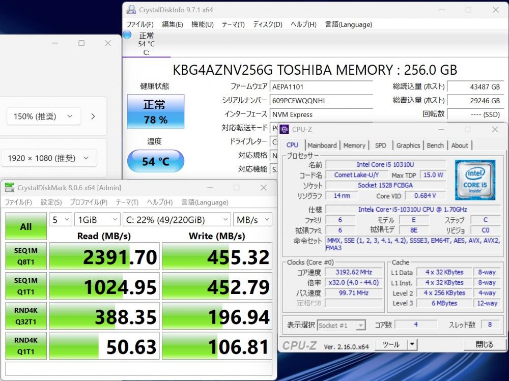 CPU:    超高速 Intel 超高性能 第10世代Core i5-10310U 1.7Ghz、 4コア8スレッド (ターボ・ブースト利用時の最大周波数 4.4GHz)