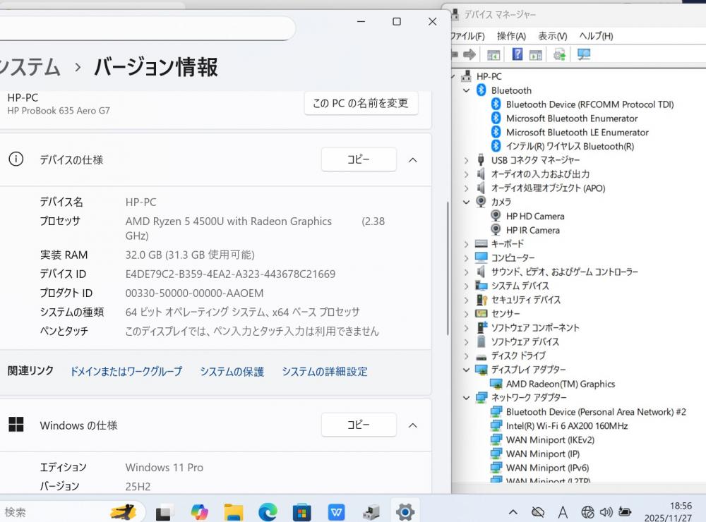 中古美品 フルHD 13.3型 HP PROBOOK 635G7 Windows11 AMD Ryzen 5-4500U 32GB NVMe 256GB-SSD カメラ 無線Wi-Fi6 Office付き 中古パソコン