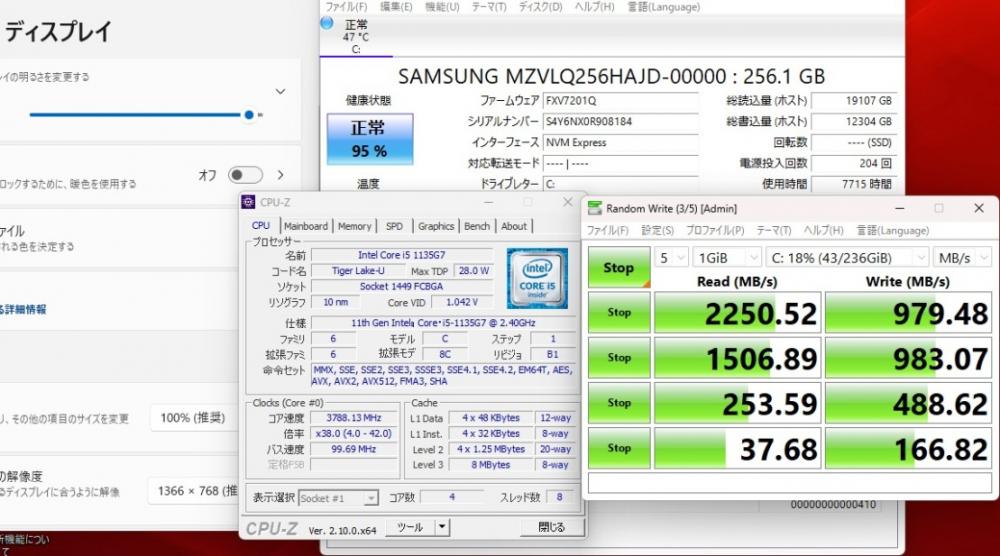 CPU:    超高速 Intel 卓越性能 第11世代Core i5-1135G7 2.4Ghz、 4コア8スレッド (ターボ・ブースト利用時の最大周波数 4.2GHz)