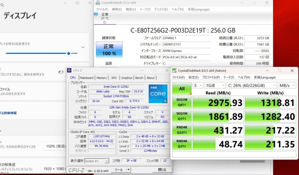 | CPU: 超高速 Intel 10コア 卓越性能 第12世代Core i5-1235u 1.3Ghz、 10コア12スレッド (ターボ・ブースト利用時の最大周波数 4.4GHz) |