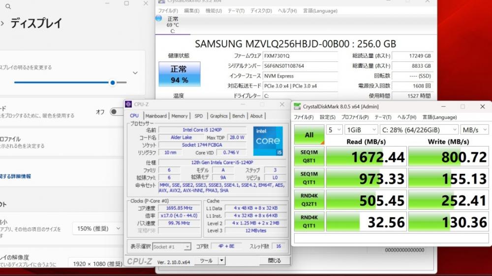 CPU:    超高速 Intel 12コア 卓越性能 第12世代Core i5-1240P 1.7Ghz、 12コア16スレッド (ターボ・ブースト利用時の最大周波数 4.4GHz)