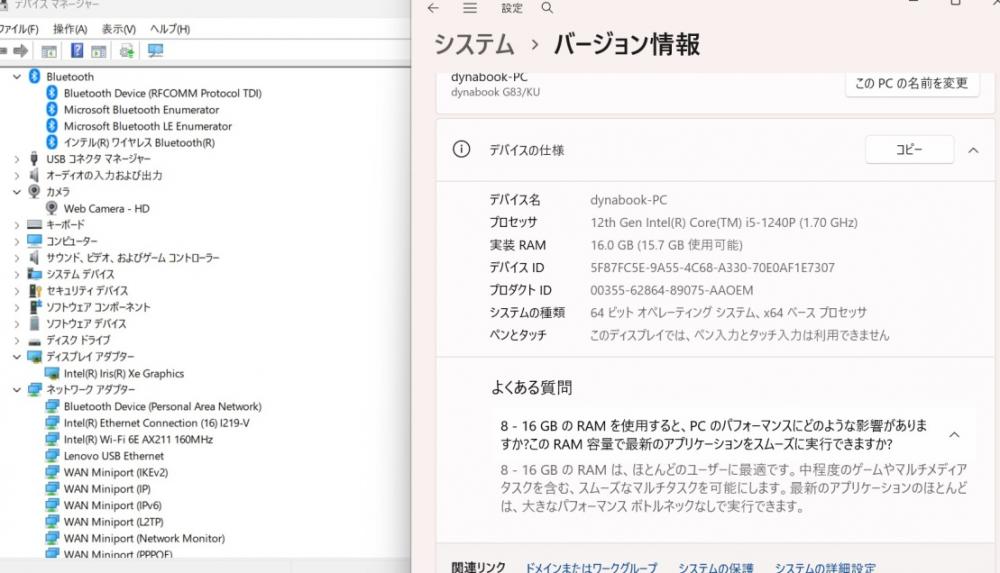 ※ Intel社のデザイン由来でパソコンのメモリーが 2枚で構成の場合は、内蔵グラフィックスの名前は「Intel Xe」表示されます。1枚構成の際その「Intel Xe」は「Intel UHD」の名前として表示します。