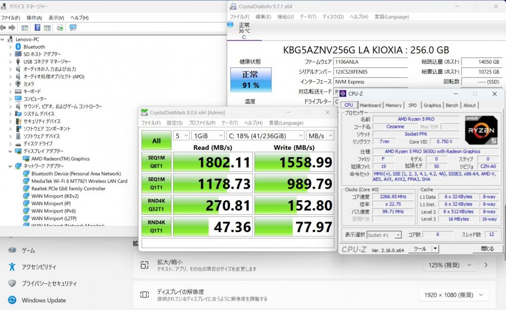 | CPU: 超高速 高性能 AMD Ryzen 5-5650U 2.3Ghz、 6コア12スレッド (ターボ・ブースト利用時の最大周波数 4.2GHz) |