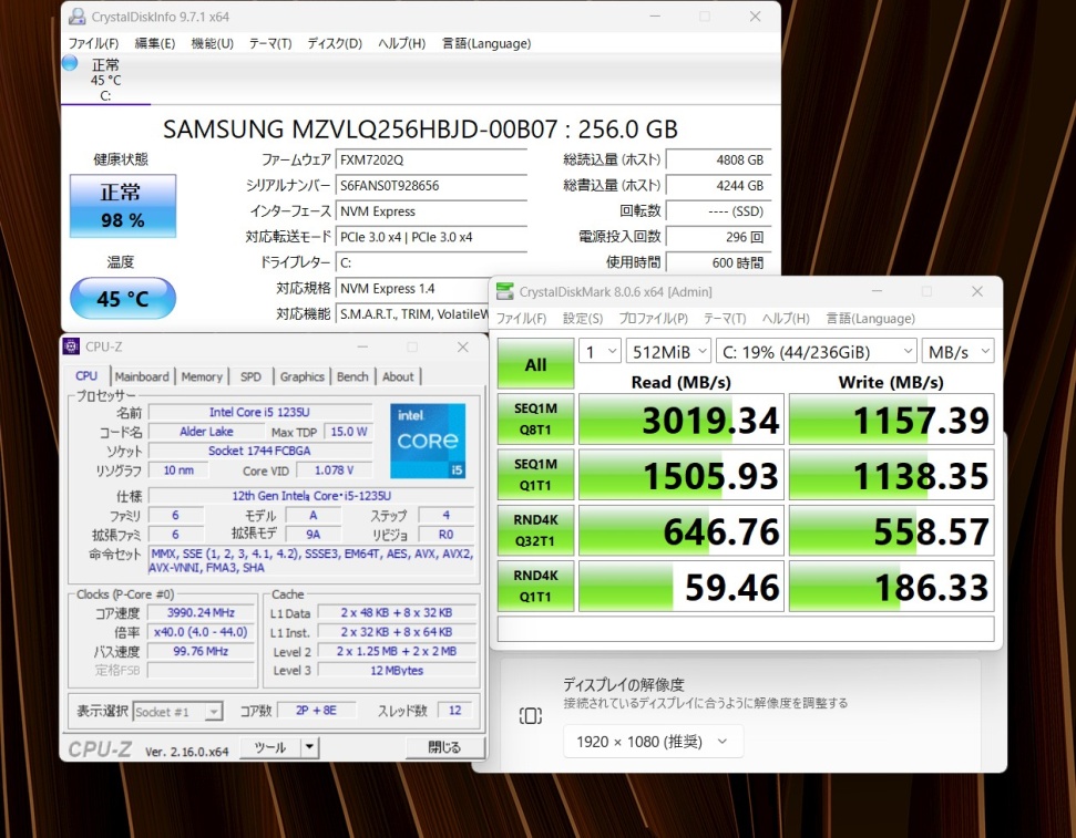 CPU:    超高速 Intel 10コア 卓越性能 第12世代Core i5-1235U 1.3Ghz、 10コア12スレッド (ターボ・ブースト利用時の最大周波数 4.4GHz)