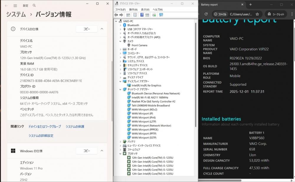 中古 フルHD 12.5型 VAIO ProPJ VPJP22 Windows11 10コア 第12世代 i5-1235U 16GB NVMe 256GB-SSD カメラ LTE 無線Wi-Fi6 Office付き 中古パソコン 管:1886w