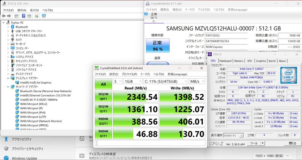 | CPU: 超高速 Intel 卓越性能 第11世代Core i7-1185G7 3.0Ghz、 4コア8スレッド (ターボ・ブースト利用時の最大周波数 4.8GHz) |