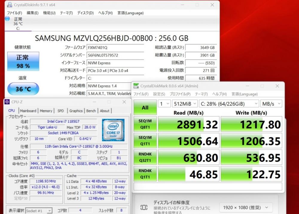 CPU:    超高速 Intel 卓越性能 第11世代Core i7-1185G7 3.0Ghz、 4コア8スレッド (ターボ・ブースト利用時の最大周波数 4.8GHz)