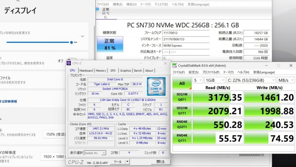 CPU:    超高速 Intel 卓越性能 第11世代Core i5-1145G7 2.6Ghz、 4コア8スレッド (ターボ・ブースト利用時の最大周波数 4.4GHz)