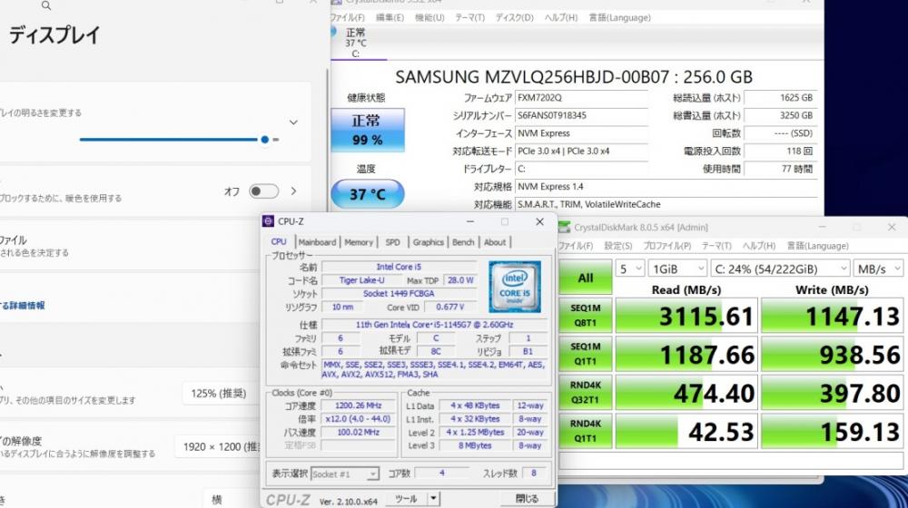 CPU:    超高速 Intel 卓越性能 第11世代Core i5-1145G7 2.6Ghz、 4コア8スレッド (ターボ・ブースト利用時の最大周波数 4.4GHz)