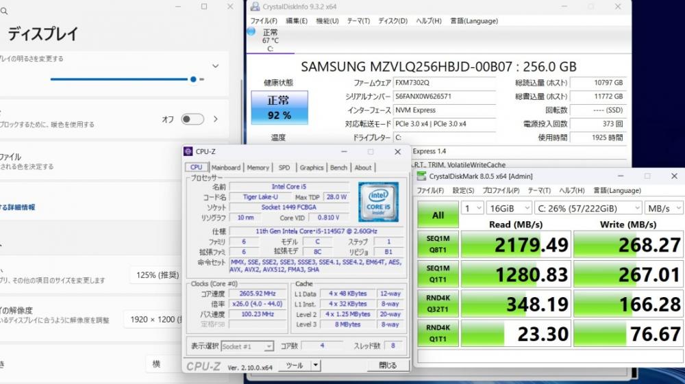 CPU:    超高速 Intel 卓越性能 第11世代Core i5-1145G7 2.6Ghz、 4コア8スレッド (ターボ・ブースト利用時の最大周波数 4.4GHz)