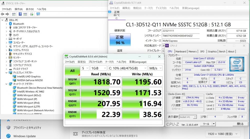 | CPU: 超高速 Intel 超高性能 第10世代Core i7-10510U 1.8Ghz、 4コア8スレッド (ターボ・ブースト利用時の最大周波数 4.9GHz) |