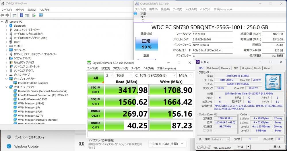 | CPU: 超高速 Intel 卓越性能 第11世代Core i5-1135G7 2.4Ghz、 4コア8スレッド (ターボ・ブースト利用時の最大周波数 4.2GHz) |