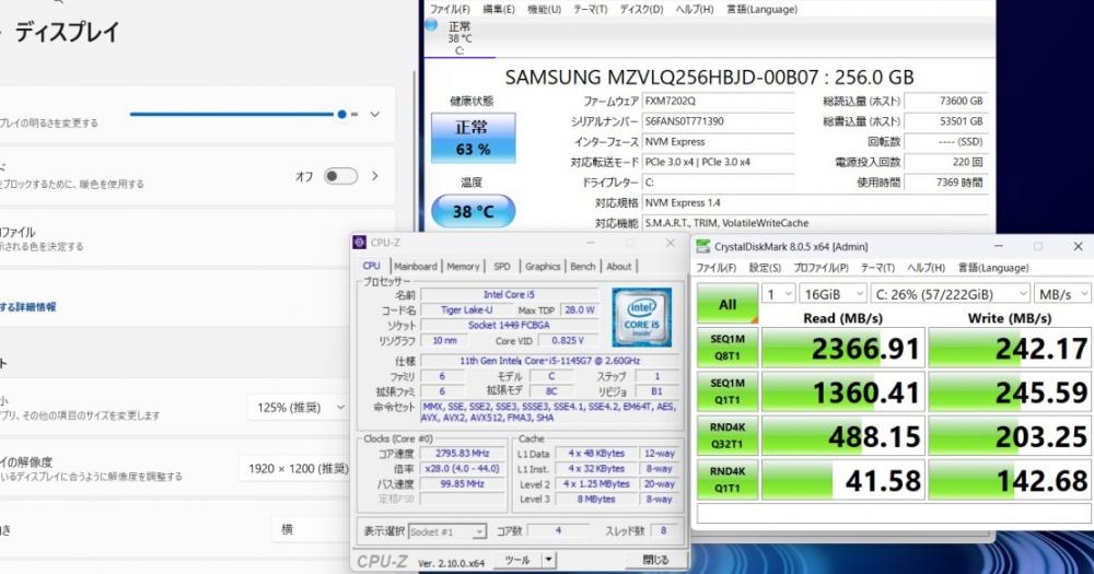 CPU:    超高速 Intel 卓越性能 第11世代Core i5-1145G7 2.6Ghz、 4コア8スレッド (ターボ・ブースト利用時の最大周波数 4.4GHz)