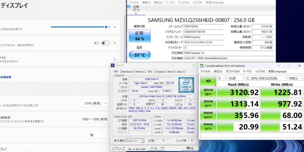CPU:    超高速 Intel 卓越性能 第11世代Core i5-1145G7 2.6Ghz、 4コア8スレッド (ターボ・ブースト利用時の最大周波数 4.4GHz)