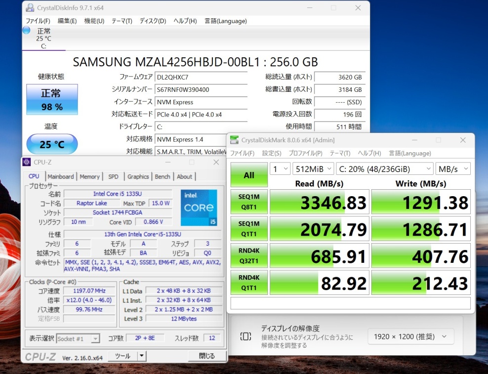| CPU: 超高速 Intel 10コア 卓越性能 第13世代Core i5-1335U 1.3Ghz、 10コア12スレッド (ターボ・ブースト利用時の最大周波数 4.6GHz) |