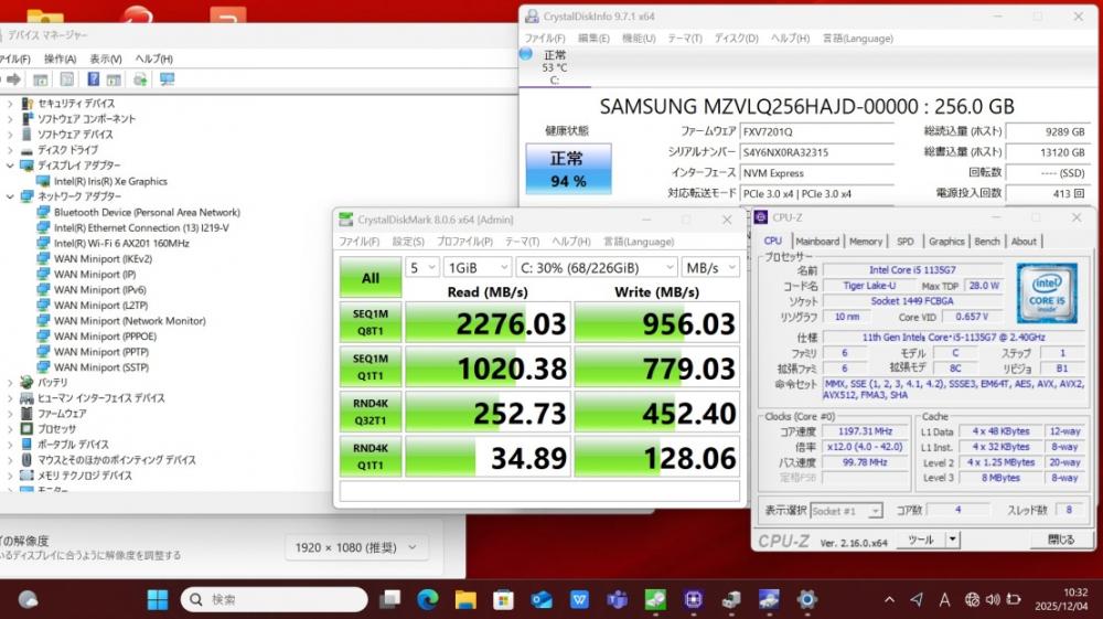 | CPU: 超高速 Intel 卓越性能 第11世代Core i5-1135g7 2.4Ghz、 4コア8スレッド (ターボ・ブースト利用時の最大周波数 4.2GHz) |
