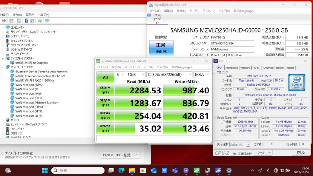 | CPU: 超高速 Intel 卓越性能 第11世代Core i5-1135g7 2.4Ghz、 4コア8スレッド (ターボ・ブースト利用時の最大周波数 4.2GHz) |