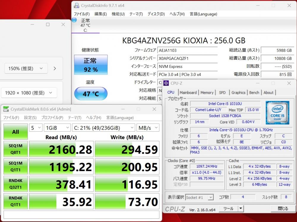 | CPU: 超高速 Intel 超高性能 第10世代Core i5-10310U 1.7Ghz、 4コア8スレッド (ターボ・ブースト利用時の最大周波数 4.4GHz) |