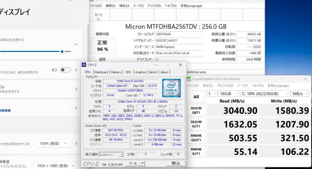 | CPU: 超高速 Intel 超高性能 第10世代Core i5-10210u 1.6Ghz、 4コア8スレッド (ターボ・ブースト利用時の最大周波数 4.2GHz) |
