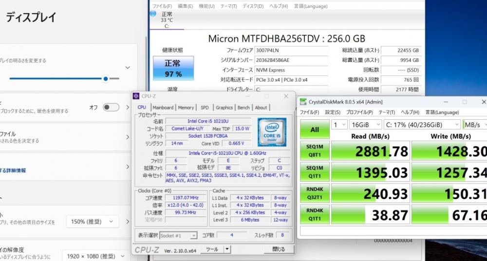 CPU:    超高速 Intel 超高性能 第10世代Core i5-10210u 1.6Ghz、 4コア8スレッド (ターボ・ブースト利用時の最大周波数 4.2GHz)