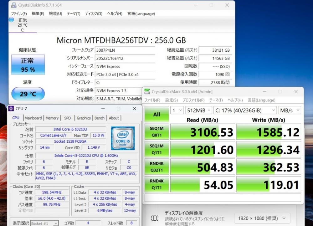 | CPU: 超高速 Intel 超高性能 第10世代Core i5-10210U 1.6Ghz、 4コア8スレッド (ターボ・ブースト利用時の最大周波数 4.2GHz) |