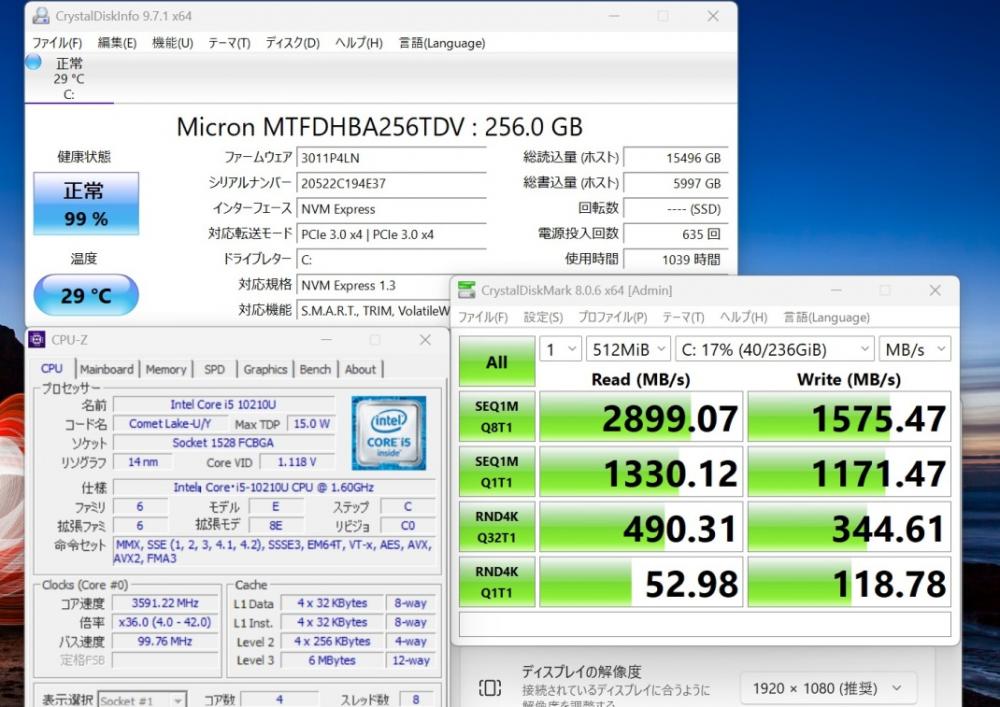 CPU:    超高速 Intel 超高性能 第10世代Core i5-10210U 1.6Ghz、 4コア8スレッド (ターボ・ブースト利用時の最大周波数 4.2GHz)