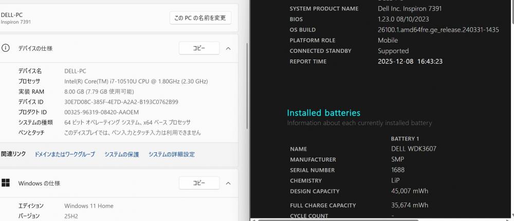 | CPU: 超高速 Intel 超高性能 第10世代Core i7-10510U 1.8Ghz、 4コア8スレッド (ターボ・ブースト利用時の最大周波数 4.9GHz) |