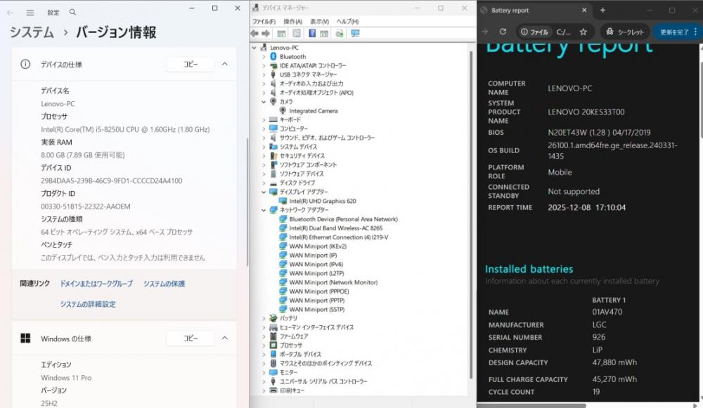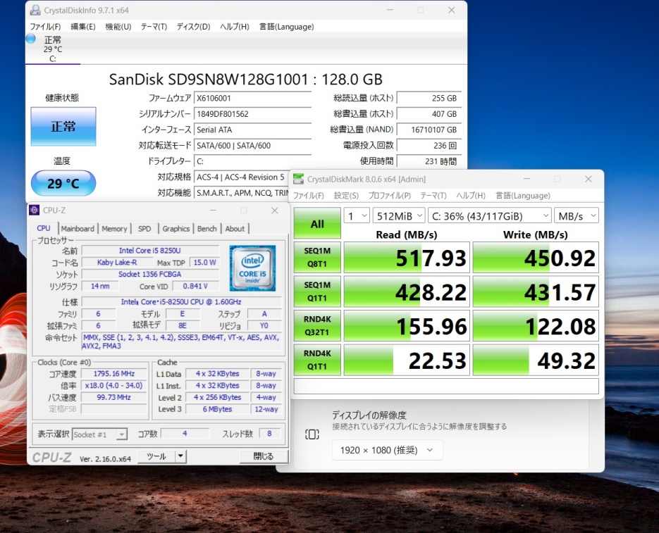 | CPU: 超高速 Intel 高性能 第8世代Core i5-8250U 1.6Ghz、 4コア8スレッド (ターボ・ブースト利用時の最大周波数 3.4GHz) |