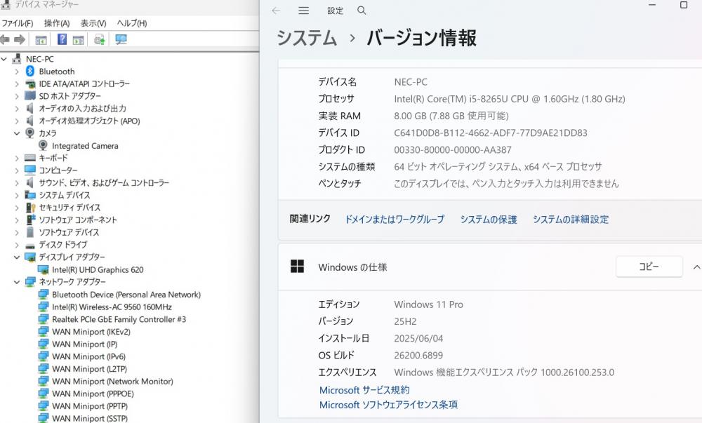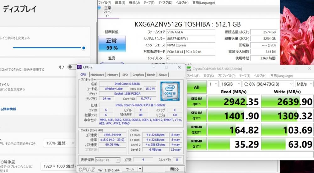 | CPU: 超高速 Intel 高性能 第8世代Core i5-8265u 1.6Ghz、 4コア8スレッド (ターボ・ブースト利用時の最大周波数 3.9GHz) |