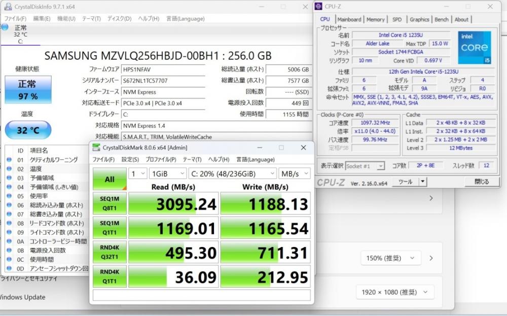 | CPU: 超高速 Intel 10コア 卓越性能 第12世代Core i5-1235u 1.3Ghz、 10コア12スレッド (ターボ・ブースト利用時の最大周波数 4.4GHz) |