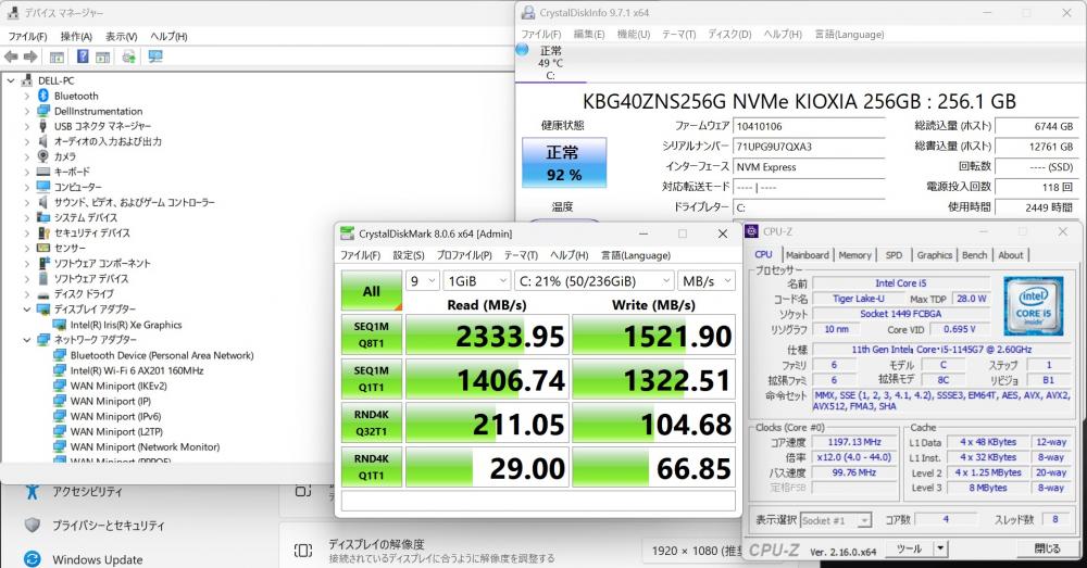 | CPU: 超高速 Intel 卓越性能 第11世代Core i5-1145G7 2.6Ghz、 4コア8スレッド (ターボ・ブースト利用時の最大周波数 4.4GHz) |