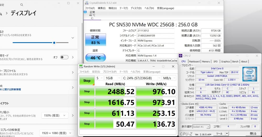 CPU:    超高速 Intel 卓越性能 第11世代Core i5-1145G7 2.6Ghz、 4コア8スレッド (ターボ・ブースト利用時の最大周波数 4.4GHz)