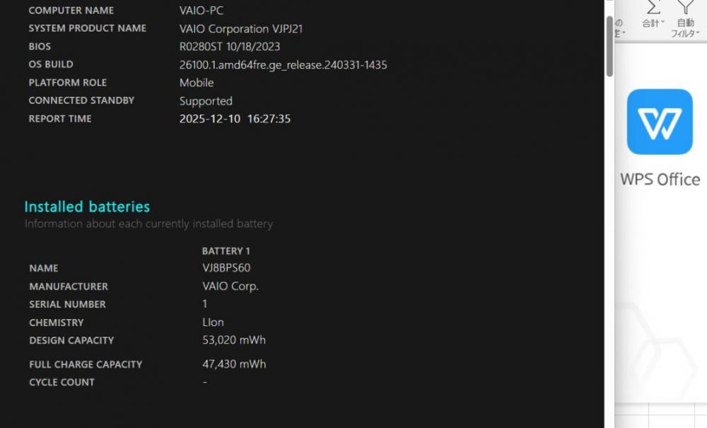 バッテリー電池の健康度は 89% です。3時間位も使用可能と表示されている。 バッテリーは消耗品の為、動作補償外となります。