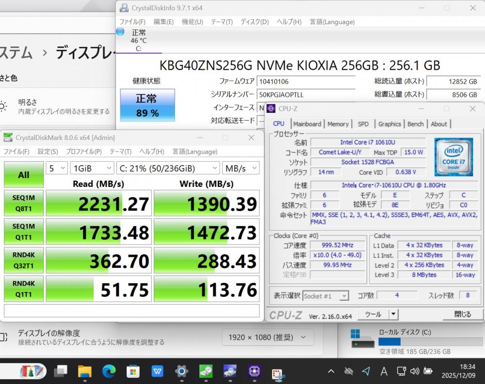 | CPU: 超高速 Intel 超高性能 第10世代Core i7-10610U 1.8Ghz、 4コア8スレッド (ターボ・ブースト利用時の最大周波数 4.9GHz) |