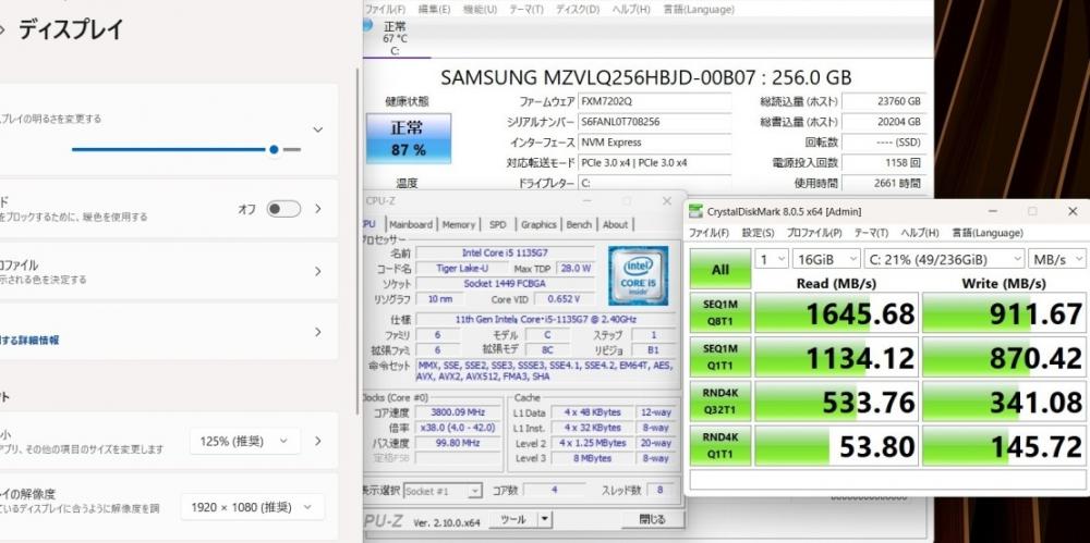 | CPU: 超高速 Intel 卓越性能 第11世代Core i5-1135G7 2.4Ghz、 4コア8スレッド (ターボ・ブースト利用時の最大周波数 4.2GHz) |