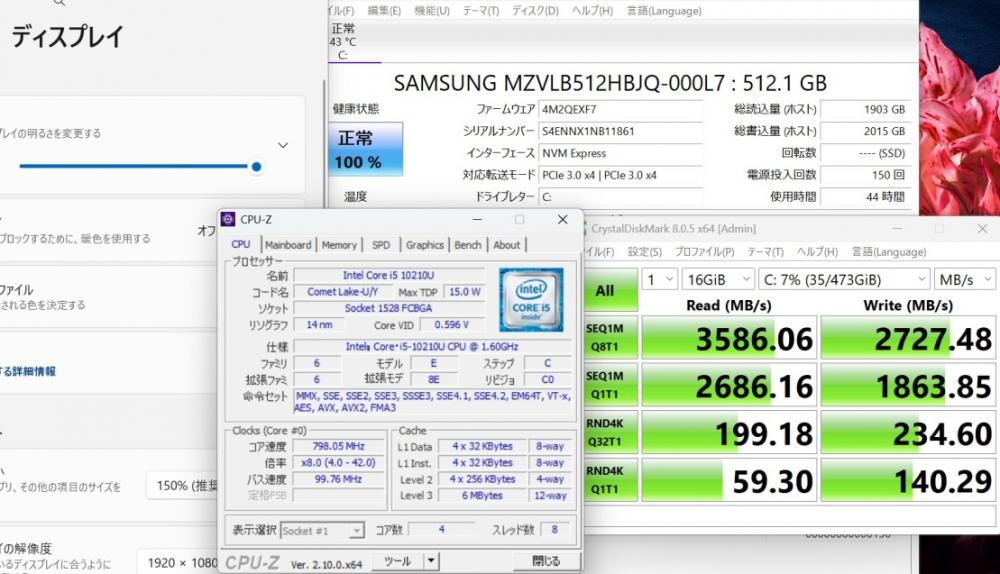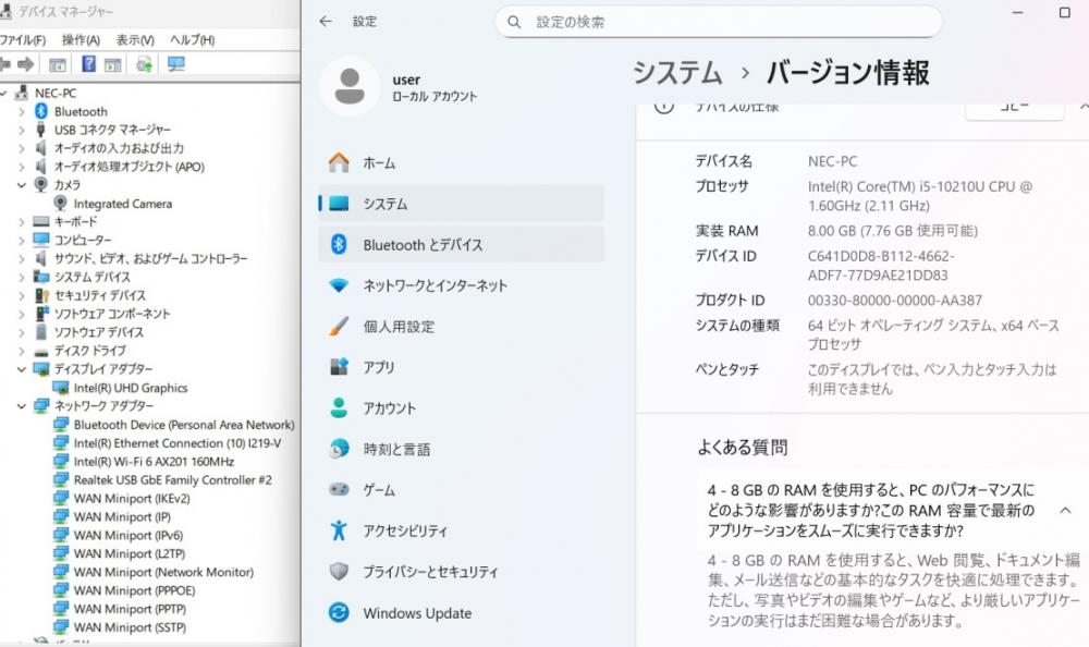 | CPU: 超高速 Intel 超高性能 第10世代Core i5-10210u 1.6Ghz、 4コア8スレッド (ターボ・ブースト利用時の最大周波数 4.2GHz) |